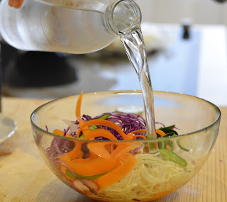 Nel frattempo, affettate le verdure pulite finemente, aiutandovi con la mandolina: cavolo cappuccio, carota pelata, zucchina solo la parte verde esterna e rapanelli.