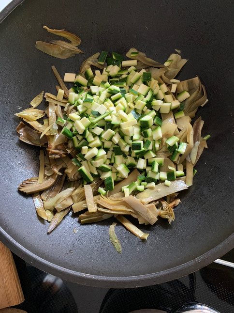 Nel frattempo, appena i carciofi saranno teneri unite le zucchine e un mestolo di brodo di cottura del riso.
